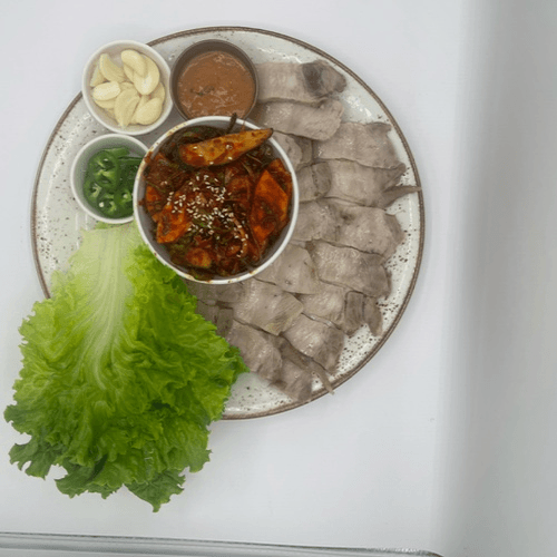 Boiled pork belly, crunch pickled veggies, lettuce wraps, sliced pepper and garlic, and fermented sauce called ssamjang