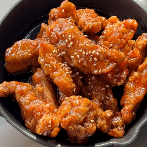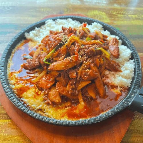 Main - Spicy Chicken and Vegetables (Cheese Buldak) Wok-fried spicy chicken and veggies on a bed of crispy rice and cheese