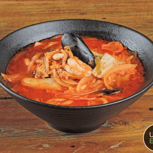 Main - Jjambong Chicken-based broth noodle soup with mixed seafood (squid, baby octopus, shrimp, mussels and baby scallop) and napa cabbage, onions, scallions and carrots. Cooked on a wok for full flavor. **Mild, Medium, or Spicy**