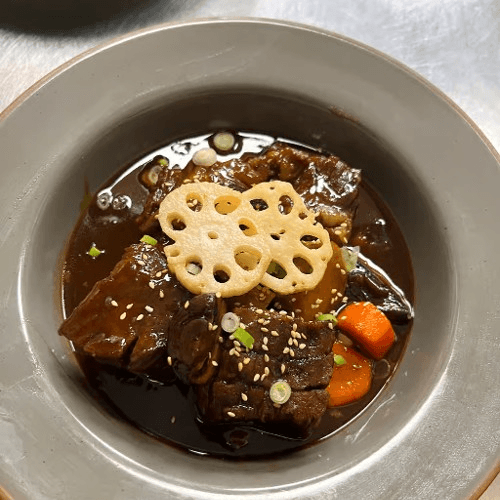 Main - Braised Beef Short Ribs (Galbijjim) Soy-braised English-cut short ribs with mini potatoes, carrots and lotus roots. Served with white rice