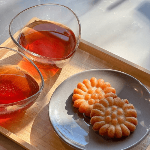 Dessert - Cinnamon Punch (SuJeongGwa) with honey cookies (Yakgwa) SuJeongGwa is a Korean traditional cinnamon punch. Made from cinnamon, sugar, water and ginger