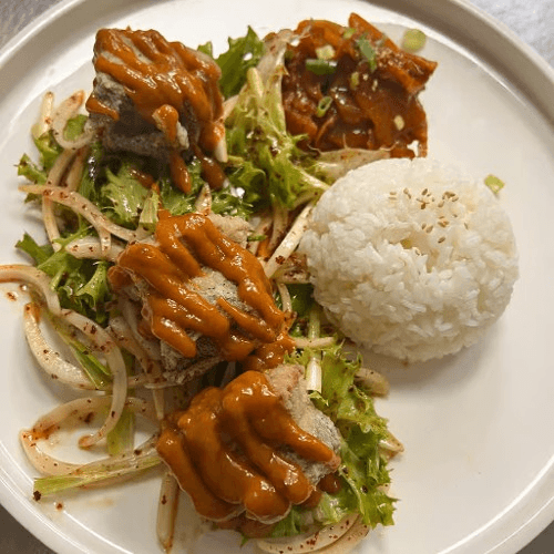 Main - Deep-fried Pork Belly Served with rice, scallMain - Deep-fried Pork Bellyion salad, and fried Kimchi