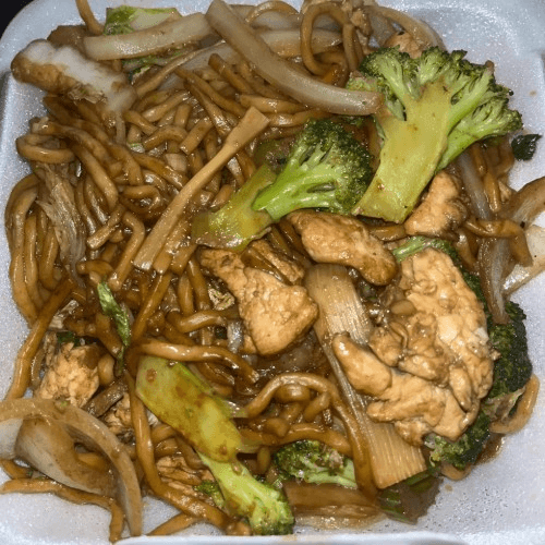 Enjoy a delicious meal with a savory small chicken lo mein plate paired with a perfectly crispy teriyaki chicken skewer, served with your choice of a refreshing drink. Perfect for lunchtime!