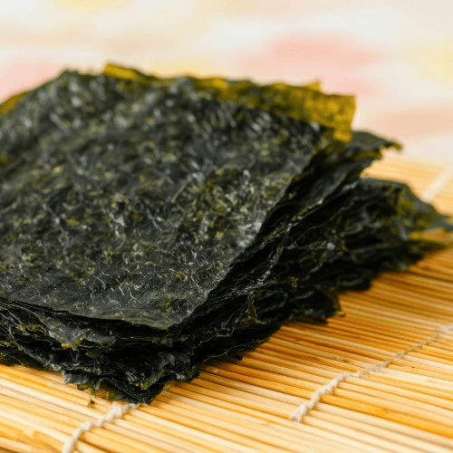 Nori seaweed sheets, typically served as a light and simple appetizer, often enjoyed for their subtle flavor and crisp texture.